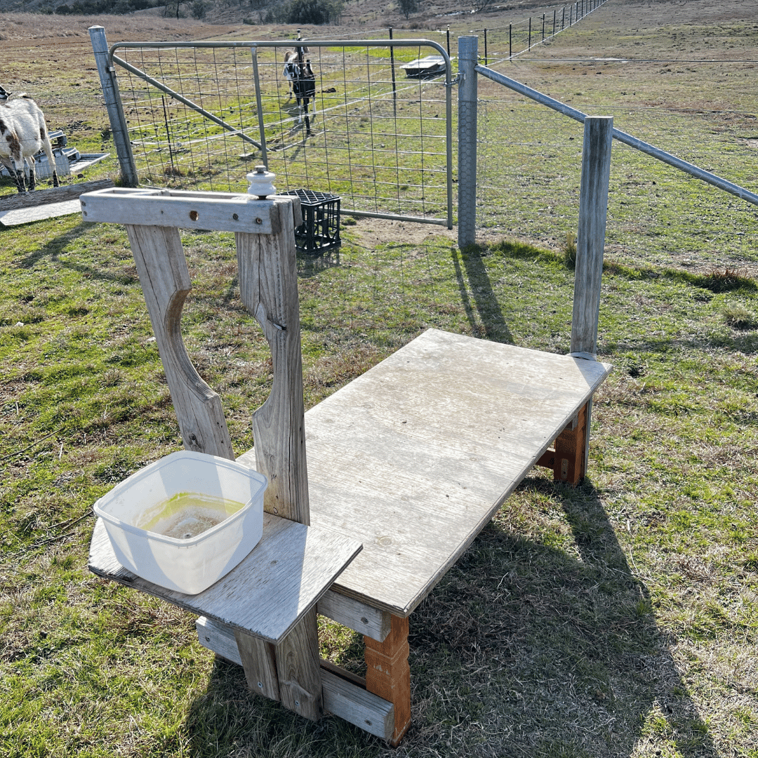 First, invest in a sturdy milking stand. This keeps your goat in place and at a comfortable height for milking. You don't need to go crazy here, we made one out of an old coffee table. See the picture below.