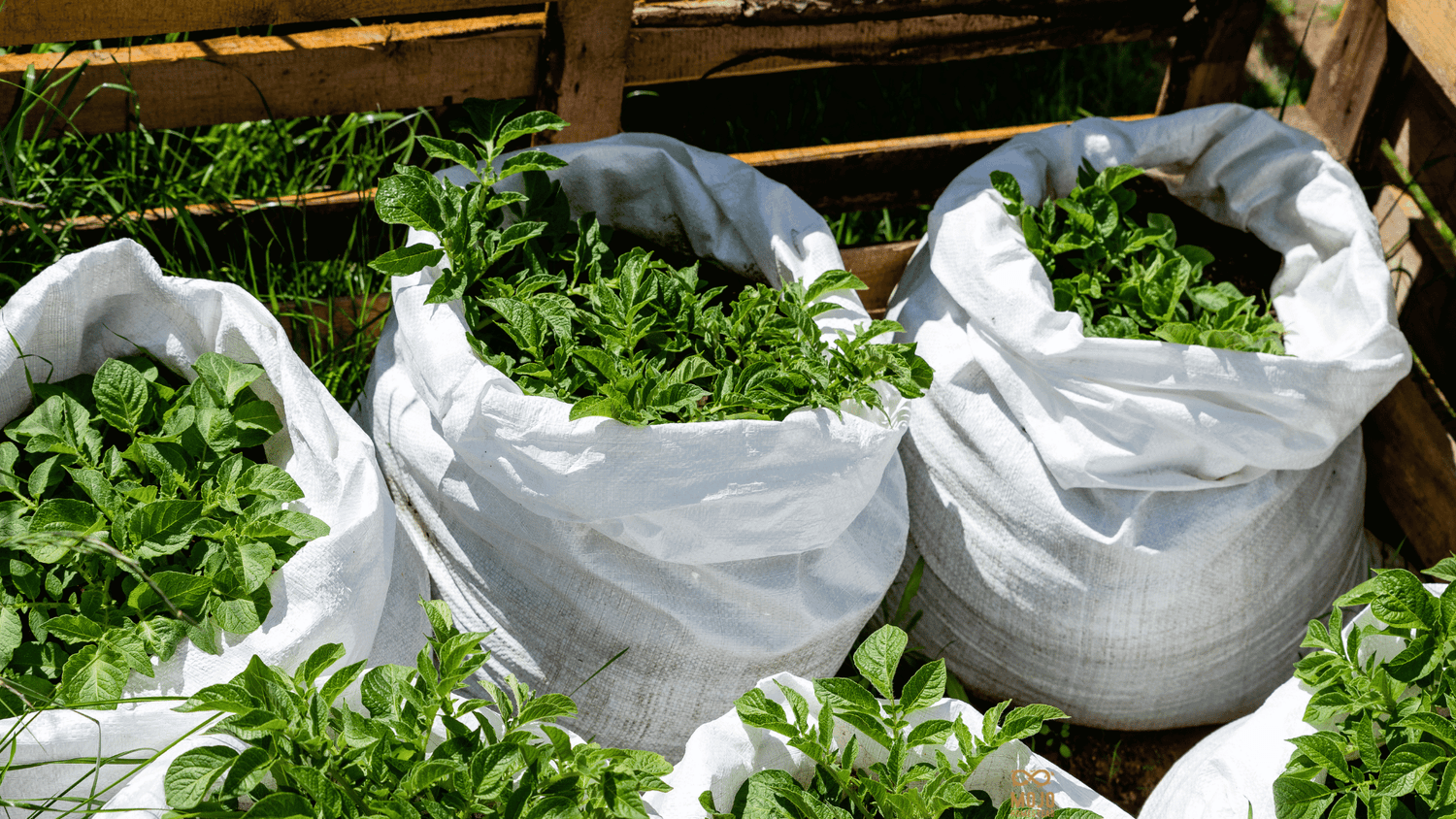 Potatoes grow brilliantly in large pots, buckets, or old feed bags. Same principle — light cover, hill up as they grow, don't overwater.