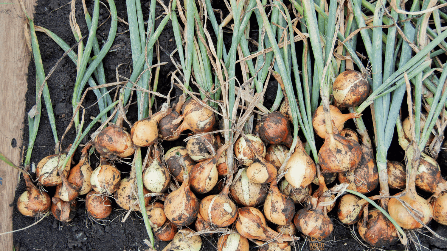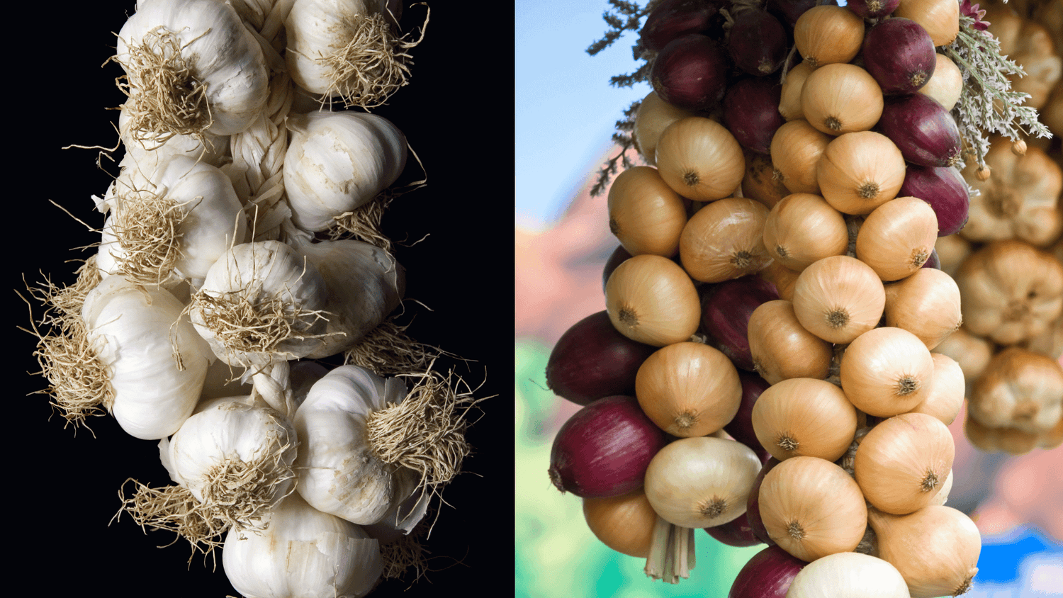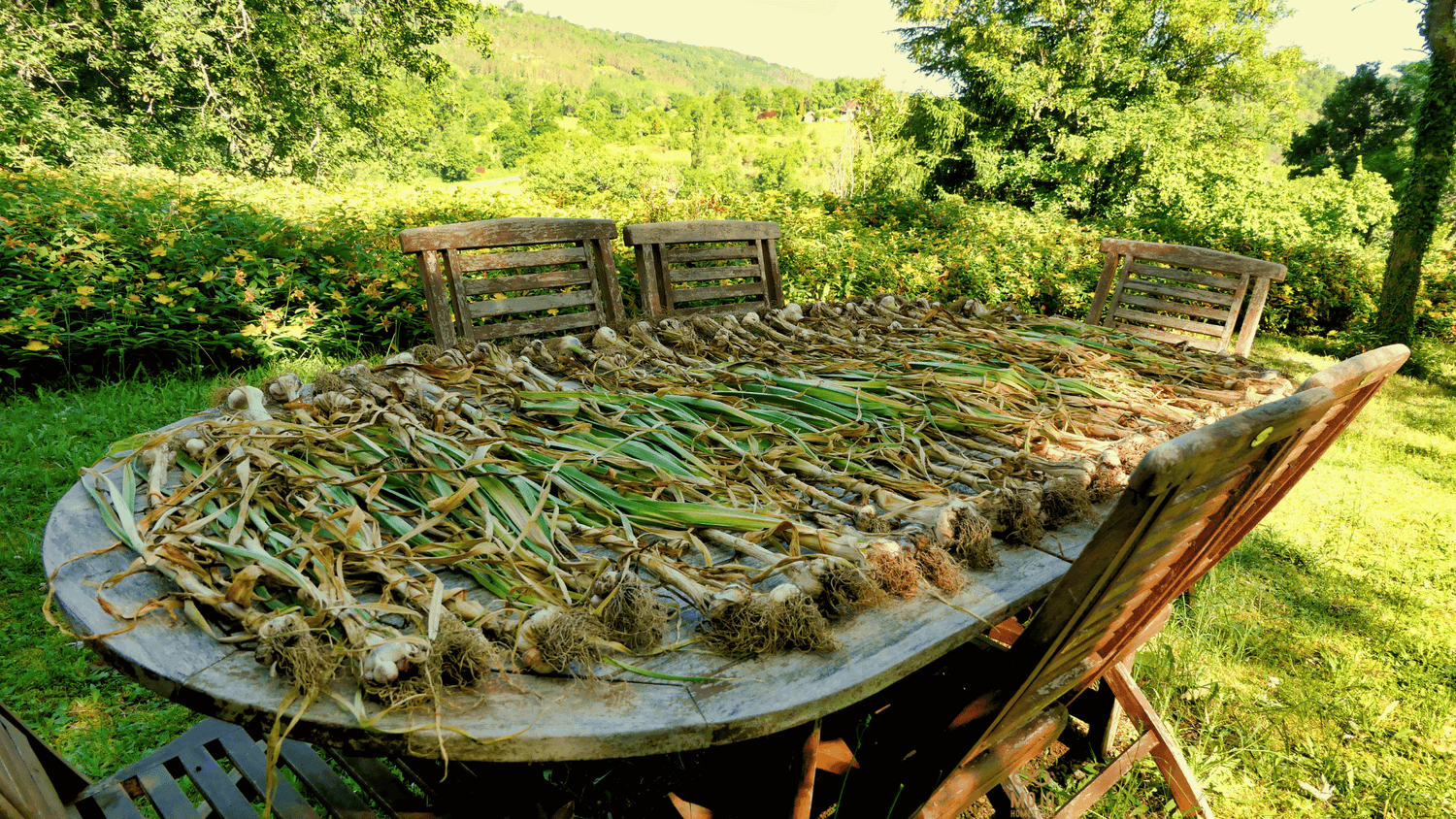 Both garlic and onions need to be cured before storage. Lay them out in a single layer in a warm, dry, well-ventilated spot — out of direct sun — for two to four weeks.