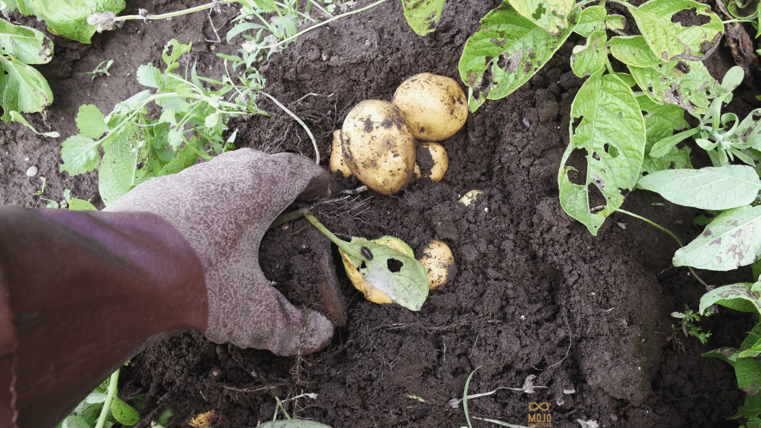 Harvest when the tops die back completely. Use a garden fork rather than a spade — you're less likely to spear your spuds.