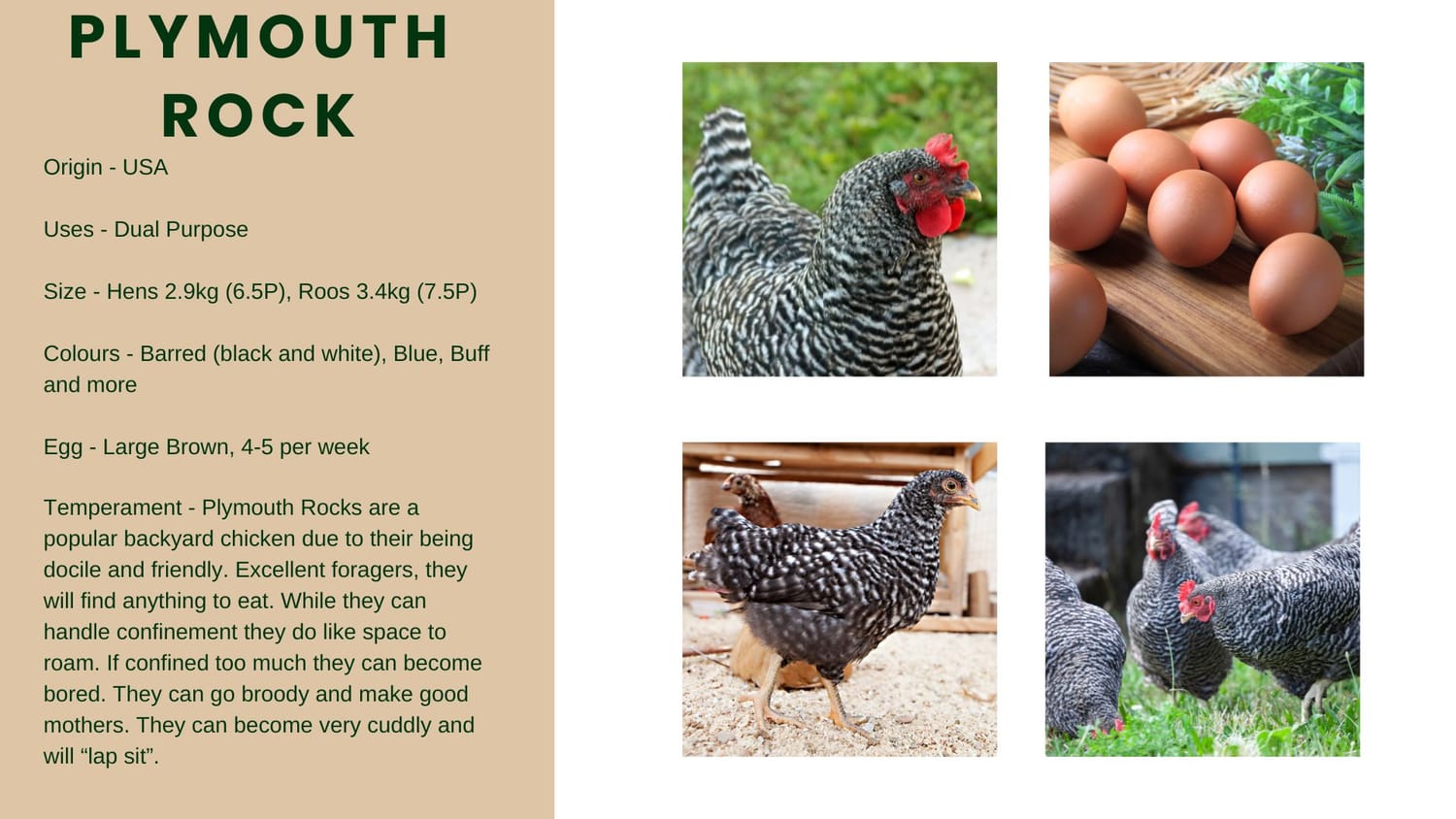 Australorps, Sussex, Plymouth Rocks: 4–6 eggs/week